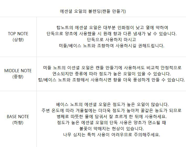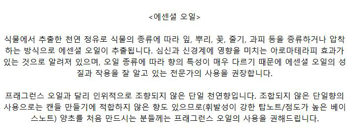 - 본 정보는 아로마테라피 교육의 목적으로만 제공되었으므로 의약품 또는 의약외품으로 오남용하지 마시기 바랍니다.