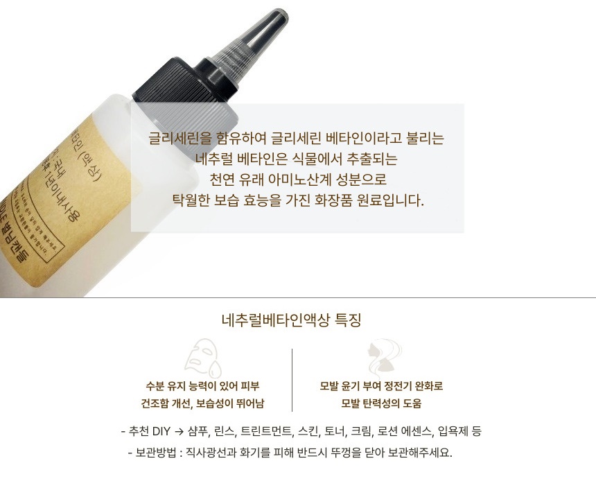 네추럴베타인액상- 용량 : 100ml- 원산지 : 핀란드- 성상 : 투명 액상 (무색무취)- PH : 6.06- 용해도S = 160 g/100 g H₂OS = 8.7 g/100 g EtOH