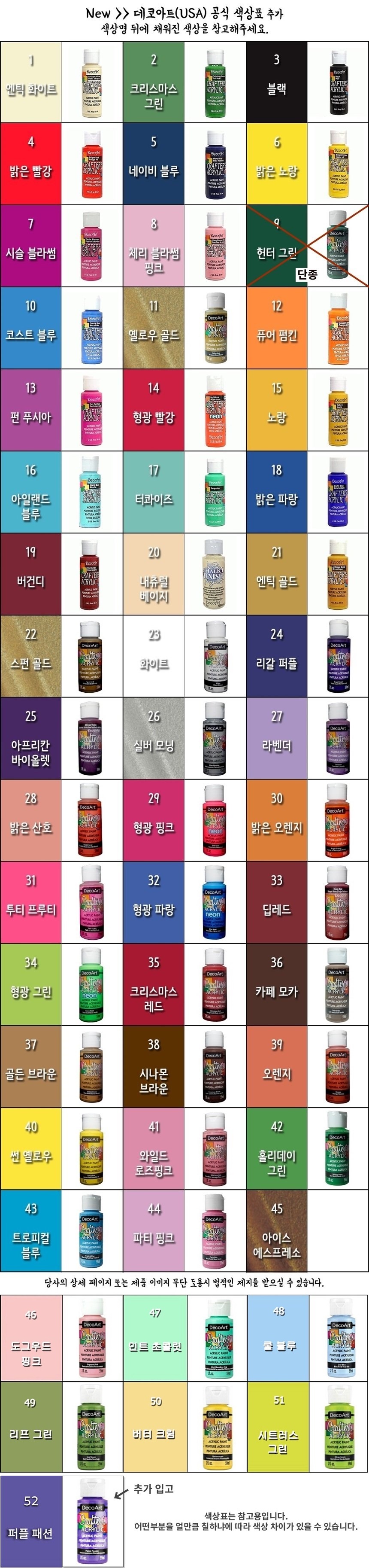> 데코아트 아크릴 물감 52색(공식 색상표 표시)