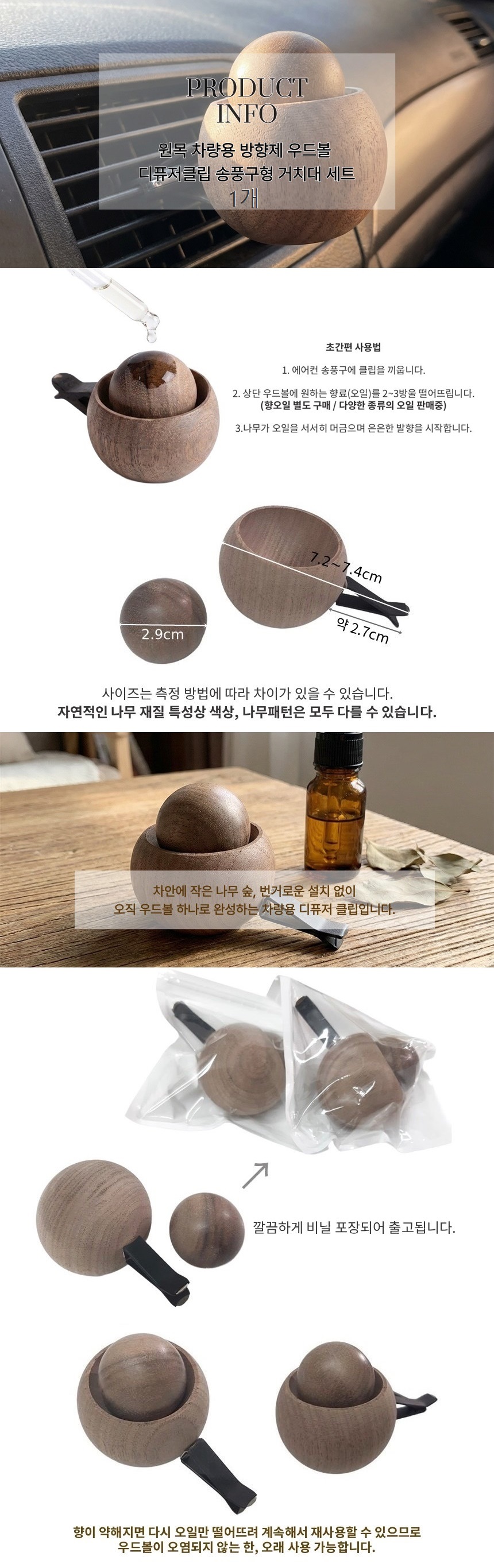 > 원목 차량용 방향제 우드볼 디퓨저클립 송풍구형 거치대 세트