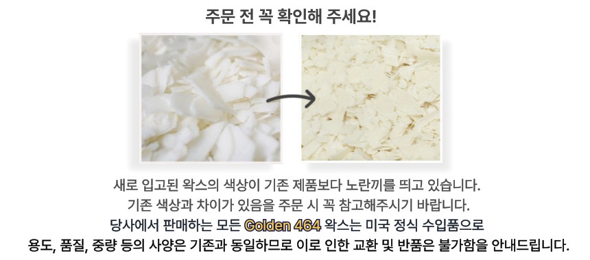 골든왁스 464▶ 녹는점 : 46.1~48.3도 ▶ 붓기 권장 온도 : 약 60도 ▶ 권장심지 : 면심지, 스모크리스심지,나무심지골든왁스의 소이왁스는 천연 아로마 향초를 집접 만들 수 있는 천연 콩왁스입니다.